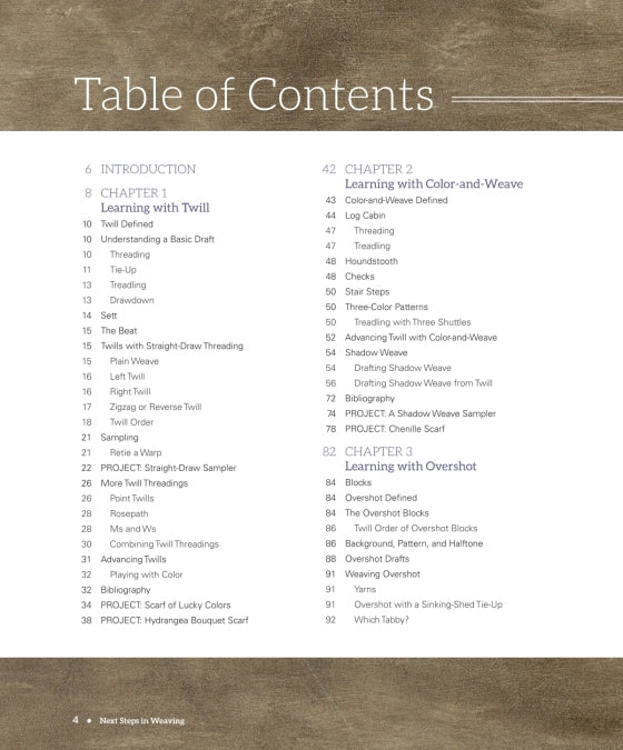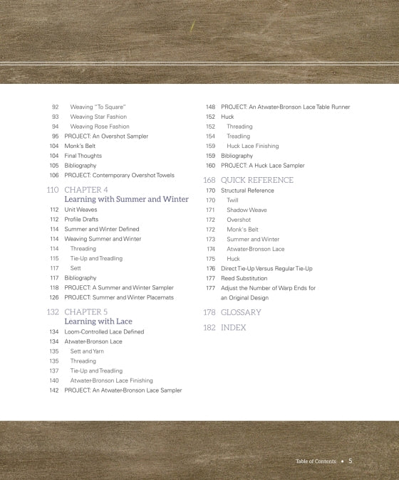 This is not just a book of weaving patterns. Each topic is explained and supplemented with instructions for weaving a sampler and a project in order to solidify the concepts and enable you to design your own projects. In addition, the book offers troubleshooting tips in order to expand your weaving expertise.