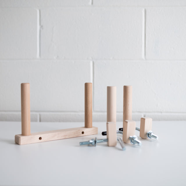 For beginner weavers or those with limited space, the warping peg offers a great way to measure yarn of any length. To use, simply clamp the double peg (used for making your cross) on one side of the table and the other pegs on the ends of the table as pictured. The deluxe warping peg set rivals a warping board in the ability to make really big warps: a 6' table can easily allow for an 8 yard warp! You can set them up however you'd like to create the length you need. These are great for those with limited space and/or those looking to avoid the cost of a larger warping board.
