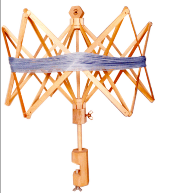 The Umbrella Swift is useful for holding skeins of yarn while winding into balls, and onto bobbins, etc. It spins around smoothly and is made of all wood construction. Clamps onto a table.