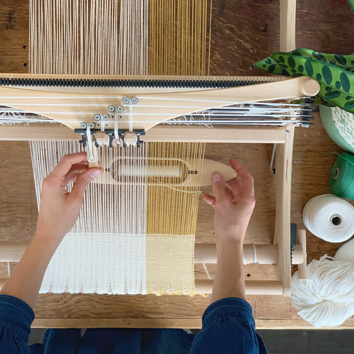 There’s a reason why these looms are treated as the gold standard weaving loom. They are incredibly flexible, producing both simple and highly complex patterns. They are efficient, allowing you to make multiple items on a single warp. They are fast to weave on, dividing the labour of weaving between your hands and your feet. And they are incredibly enjoyable to use. Floor loom weaving is what often comes to beginners’ minds when they picture weaving--the rhythm of shafts rising and falling, a shuttle flying back and forth, and a long roll of finished work slowly building up around the cloth beam.