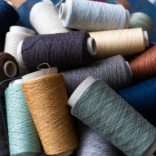When luxury fashion brands order more yarn than they can use, the leftovers are sold off on large cones referred to as 'mill ends'. Gather mill ends are premium yarns from the European fashion industry available in quantities too small for regular production. Using these yarns for weaving allows us to use up this material that might otherwise go to waste. It also allows us access to premium fibers that are hard to find!