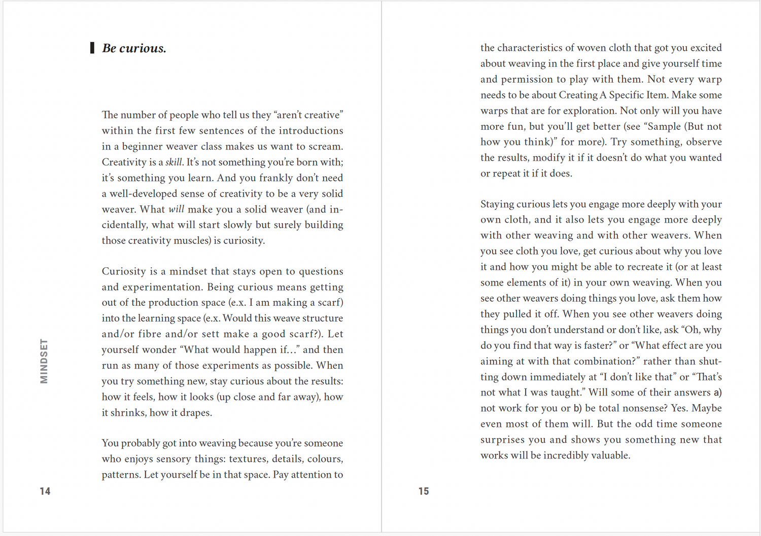 Curiosity is a mindset that stays open to questions and experimentation. Being curious means getting out of the production space (e.x. I am making a scarf) into the learning space (e.x. Would this weave structure and/or fibre and/or sett make a good scarf?). Let yourself wonder “What would happen if…” and then run as many of those experiments as possible. When you try something new, stay curious about the results: how it feels, how it looks (up close and far away), how it shrinks, how it drapes.